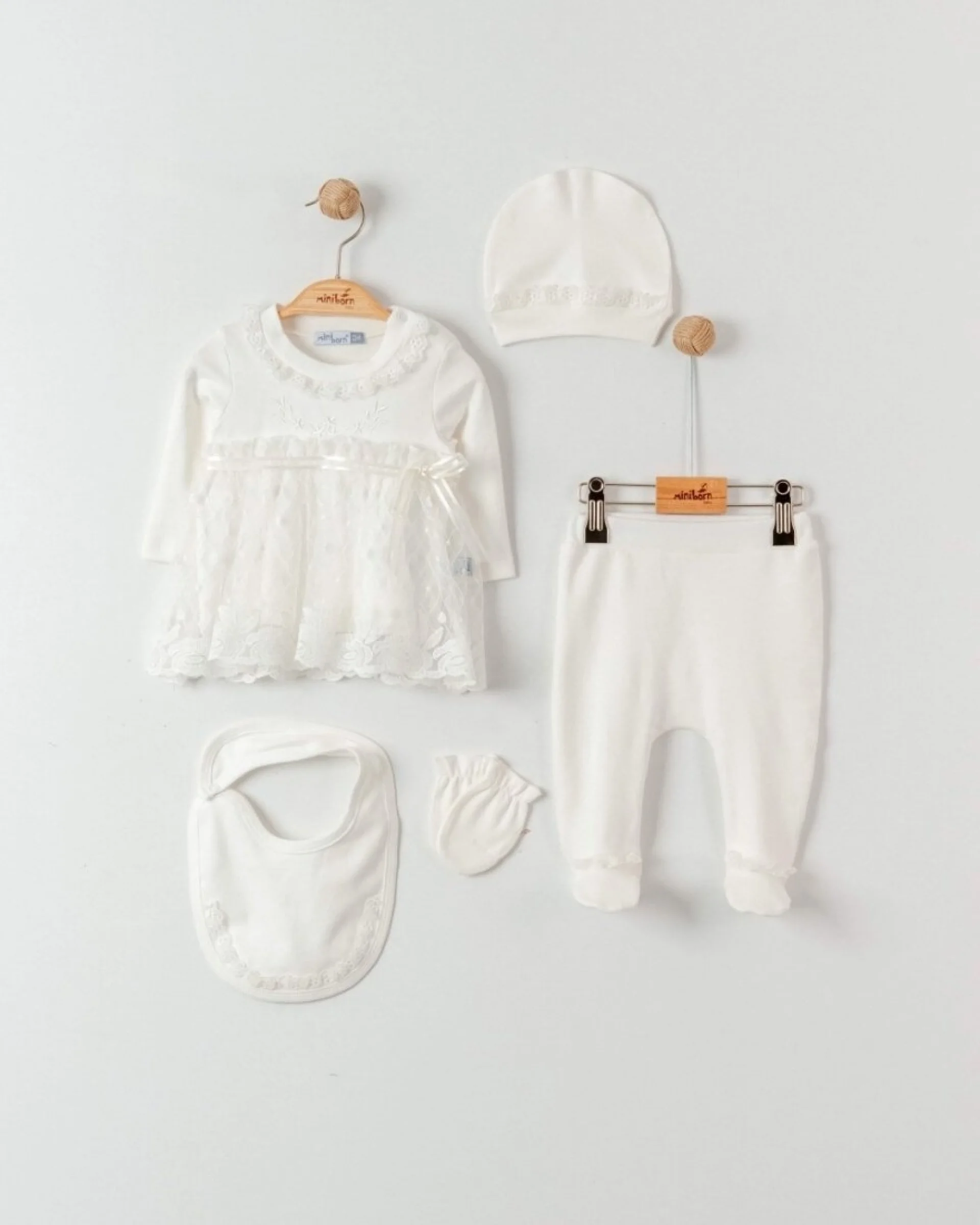 Комплект за изписване от 5 части : Лека памучна блузка (рокличка) с нежна дантелка , ританка , лигавник , шапка и ръкавелки