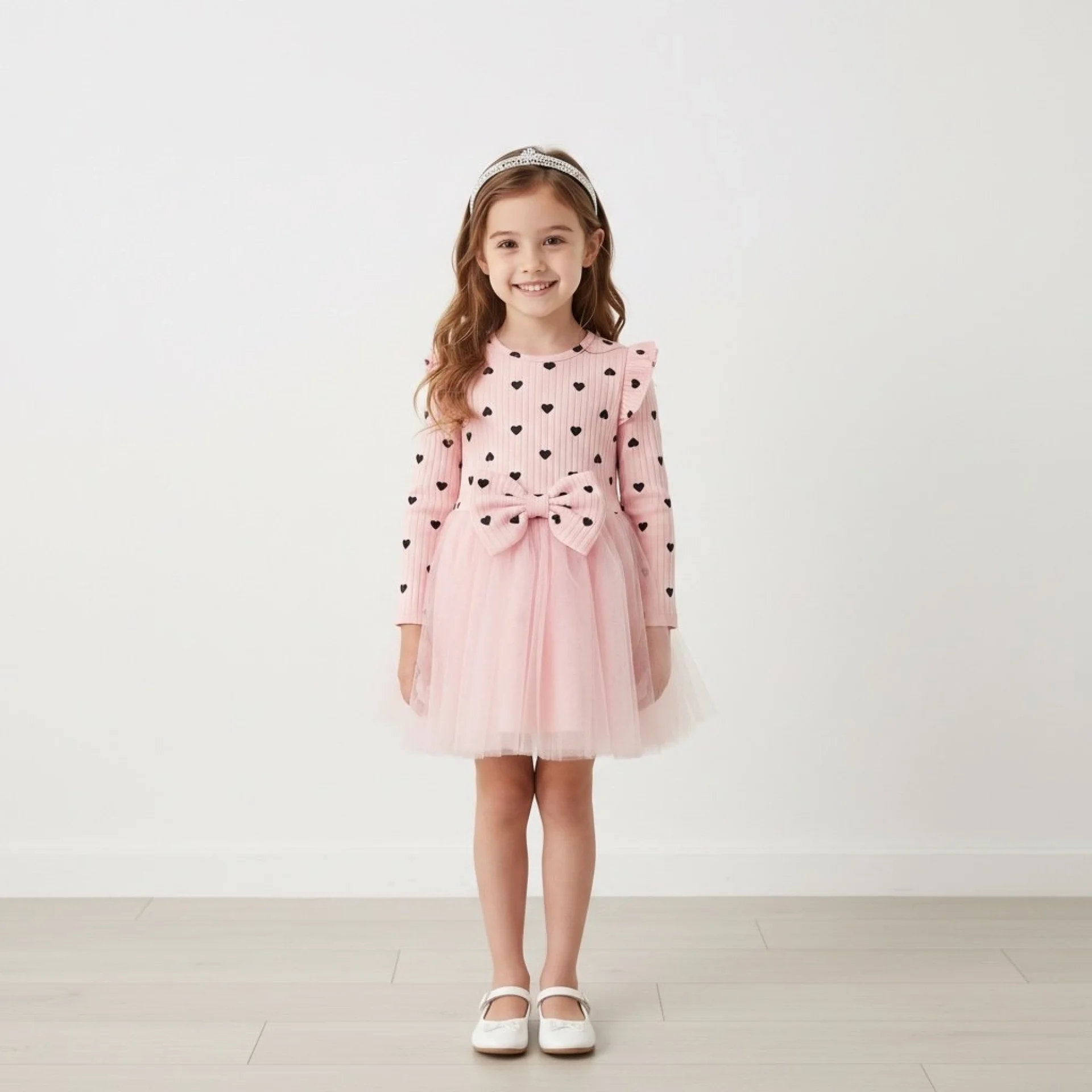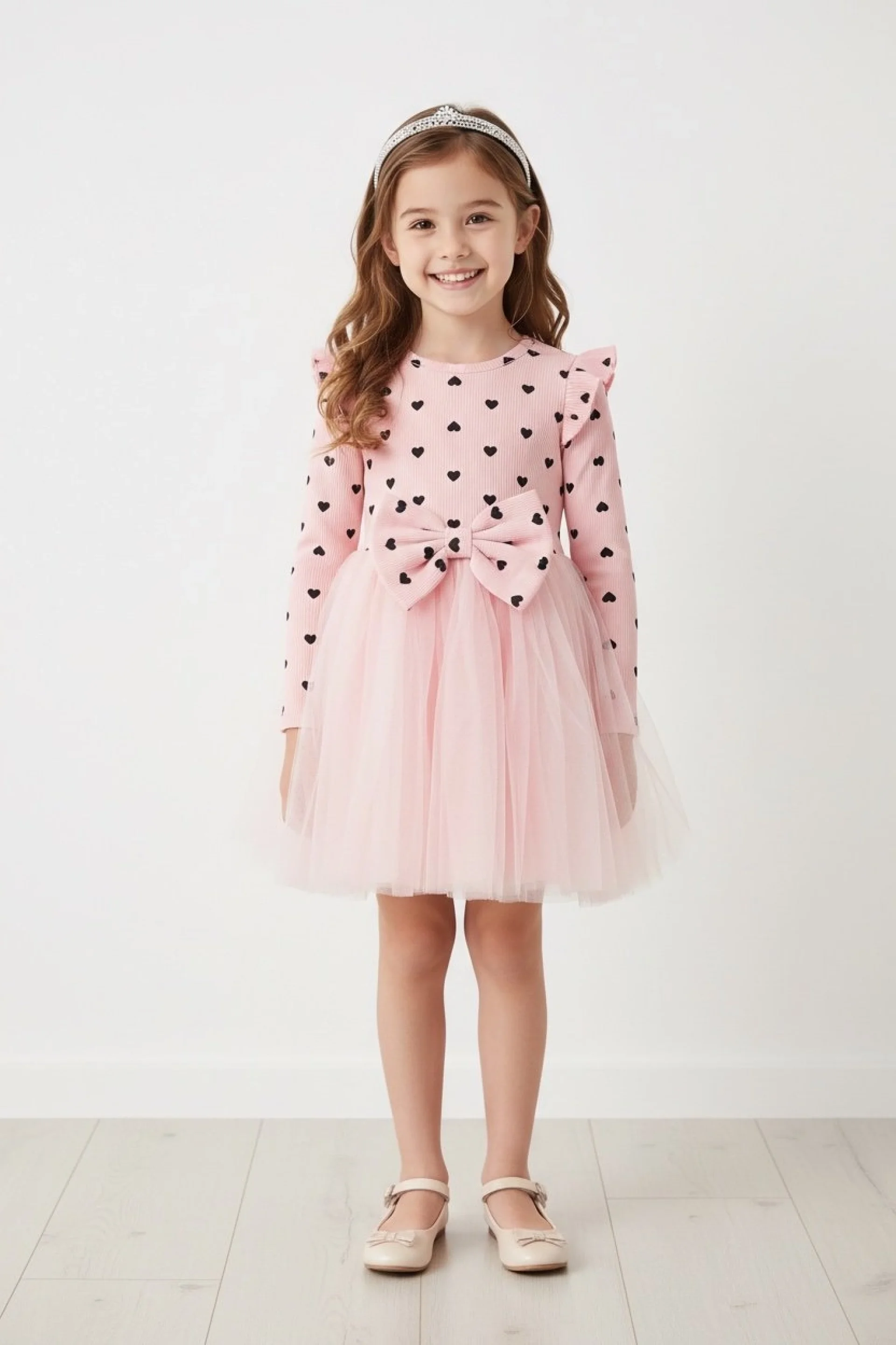 Прекрасна рокличка за малка госпожица в нежен розов цвят , декорирана със сърчица , панделка и тюл в розово .